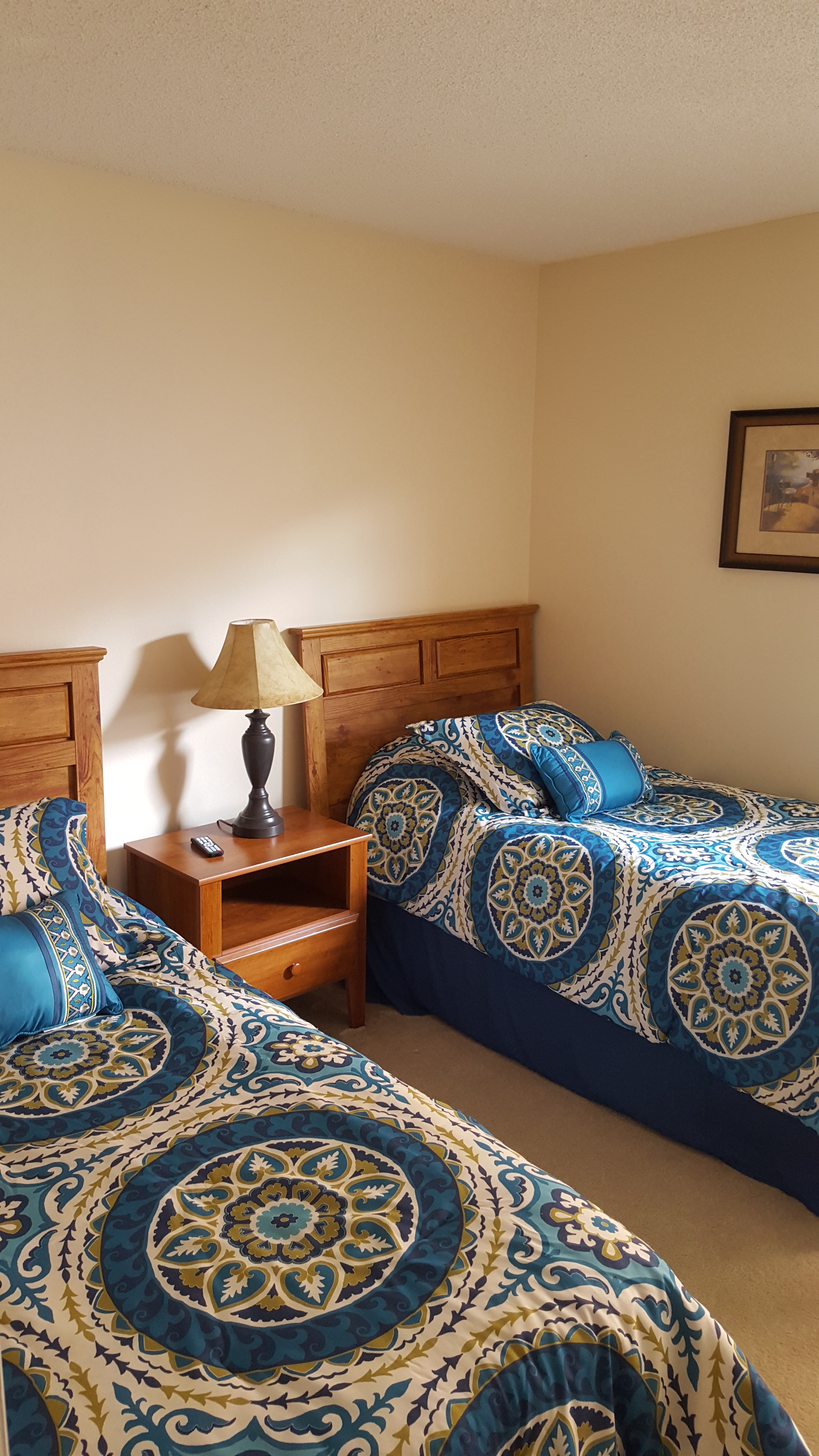 Twin beds a set of drawers, lamp and plenty of closet space, cable TV/VHS combi.